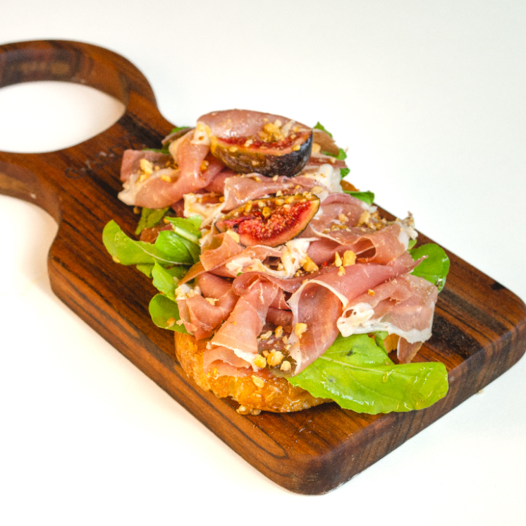 Pão Italiano tostado, com Pesto, presunto de Parma, figos, finalizadas com um fio de azeite trufado e mel.