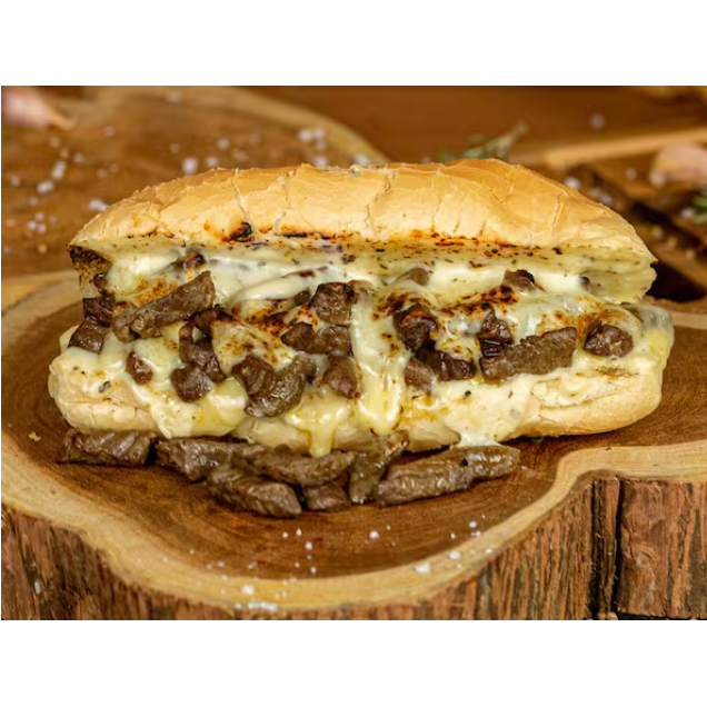 130 gramas de carne assada na brasa,baguete com parmesão em cima tostadinho,queijo mussarela, Catupiry de boa qualidade,maionese temperada e barbecue.