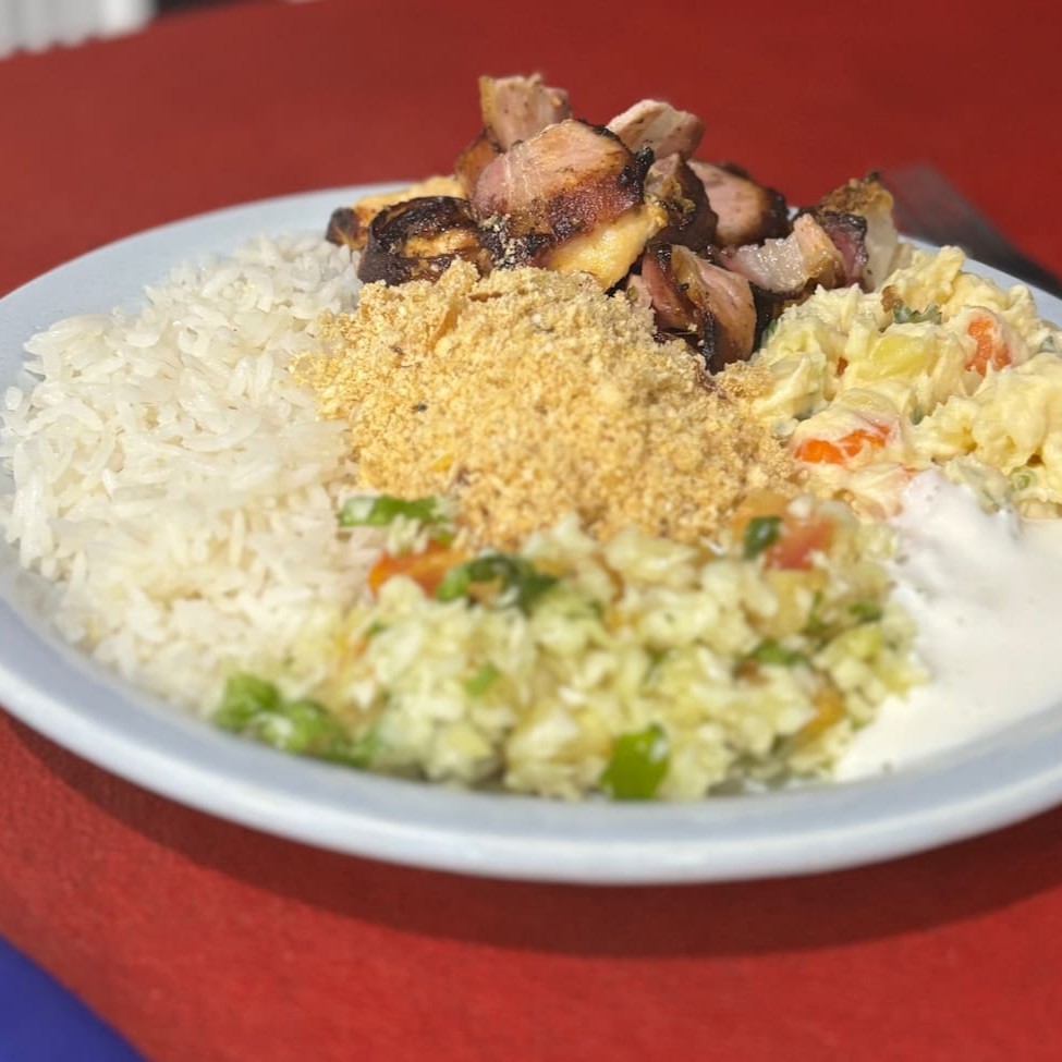 Arroz, salada de vinagrete (repolho, tomate e salsa/coentro) salada de maionese (batata, cenoura e salsa/coentro), farofa, molho de alho e espeto (a escolher)