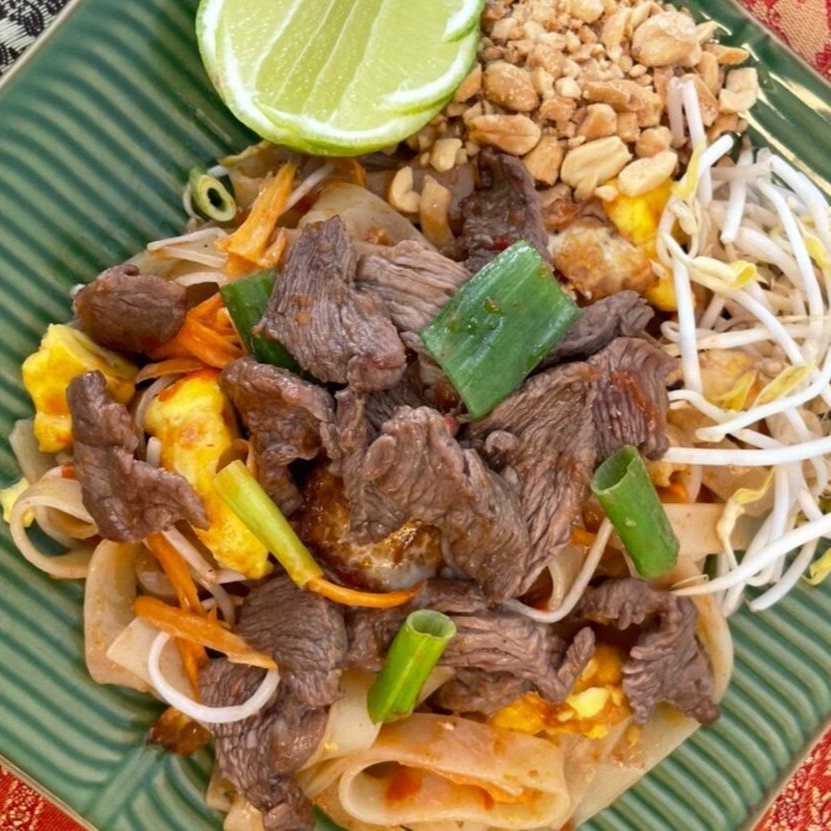 Talharim de arroz preparado com molho de tamarindo, molho agridoce, ovos, carne bovina, cebola roxa, broto de feijão e cebolinha. Acompanha amendoim e limão. Adocicado. Tamanho para 3 pessoas