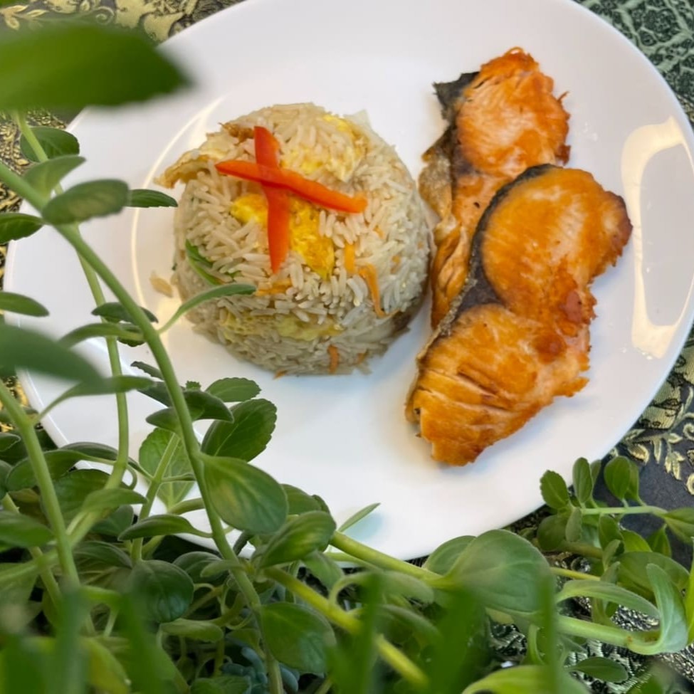 Arroz frito preparado com molho de ostra, ovos, cenoura cebola cebolinha e Salmão grelhado.