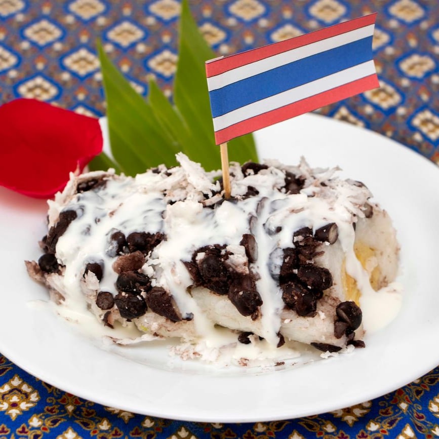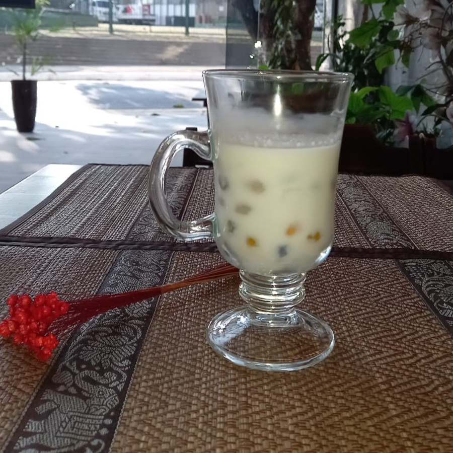 Doce de arroz moti cozido com leite de coco, preparado com feijão preto, fatias de banana, com calda de leite de coco.