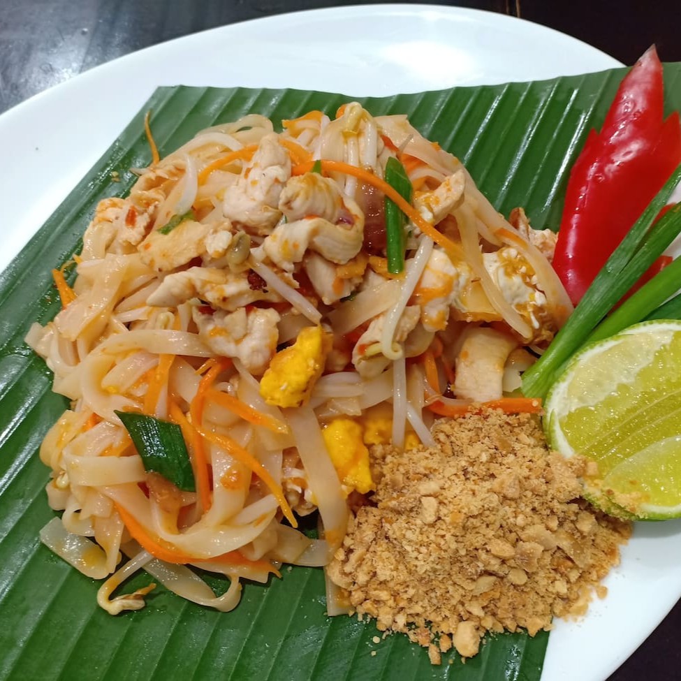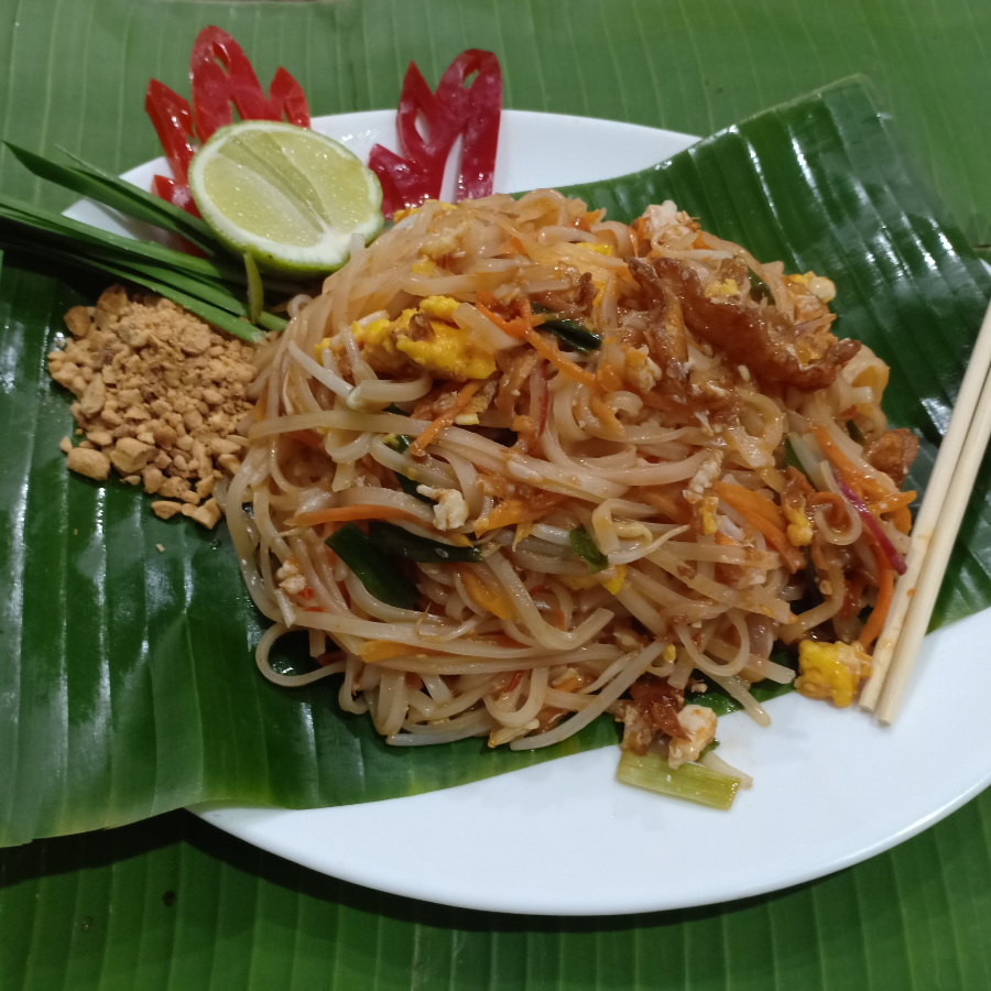 Talharim de arroz preparado com molho de tamarindo, molho agridoce, ovos, camarões inteiros, lula, mexilhão, cebola roxa, cenoura, broto de feijão e cebolinha. Acompanha amendoim e limão. Adocicado. Para 3 pessoas