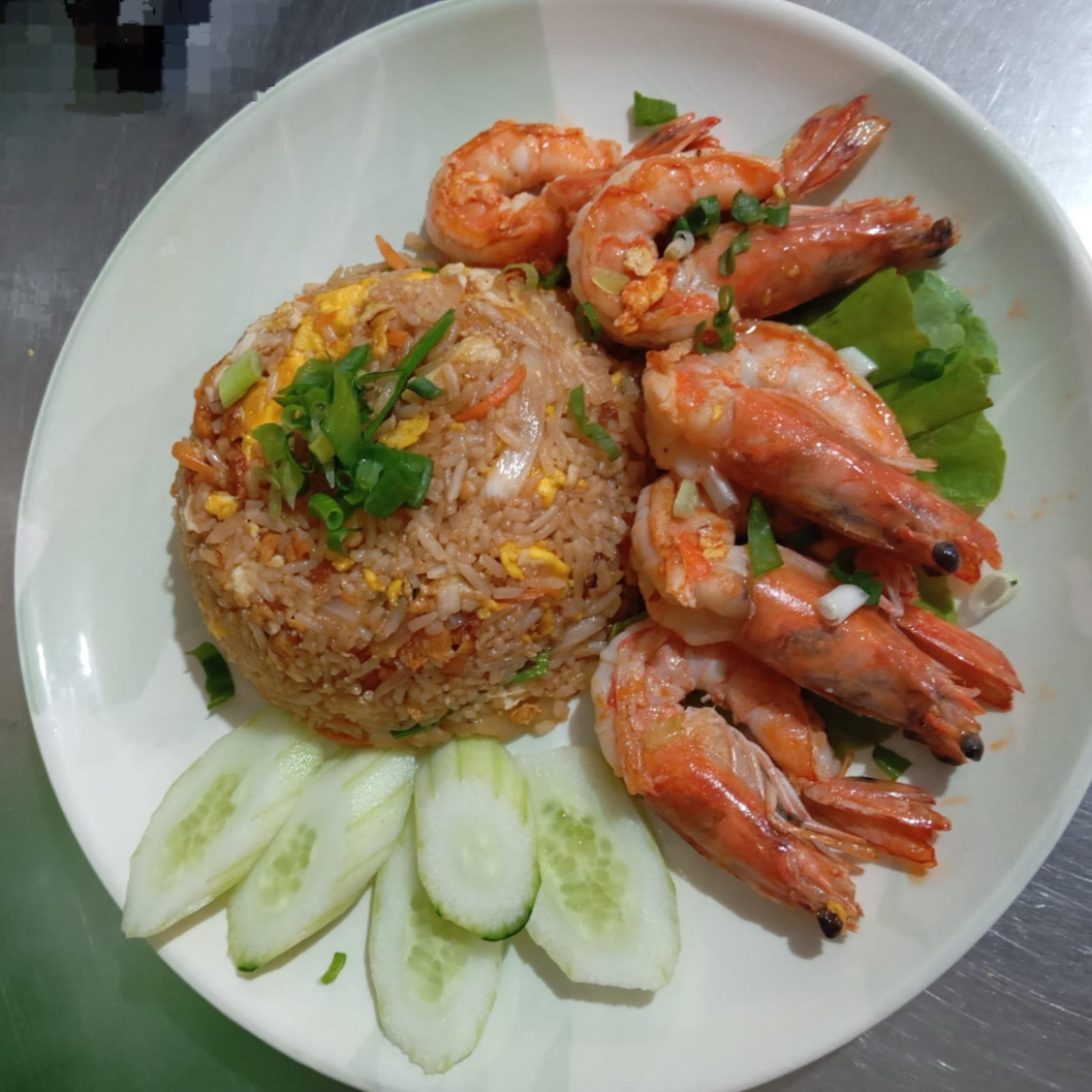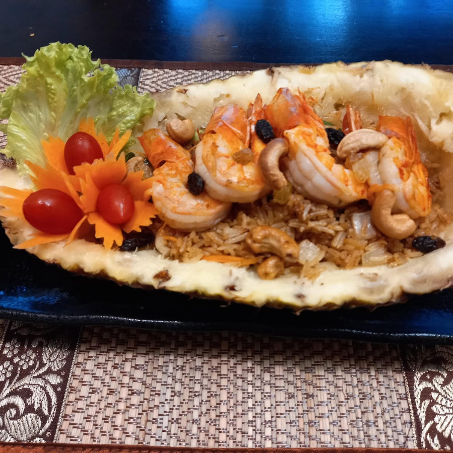 Arroz frito preparado com camarão,abacaxi, curry em pó, castanha de caju uva passa ,molho de ostra, ovos, cenoura cebola e cebolinha.