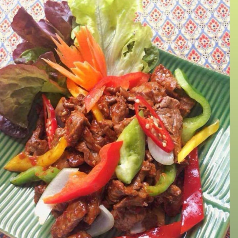 Arroz frito preparado com molho de pimenta, molho de peixe, frango, pimentão, cebola e manjerição. Medio pimentado
