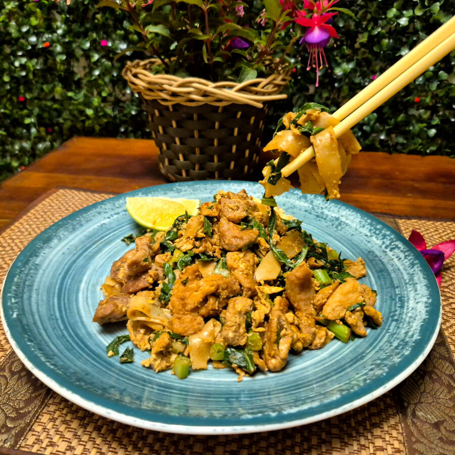 Macarrão de arroz preparado com carne de porco, ovos, couve de manteiga, molho de ostra e shoyo adocicado, limao, amendoim e pimenta.
