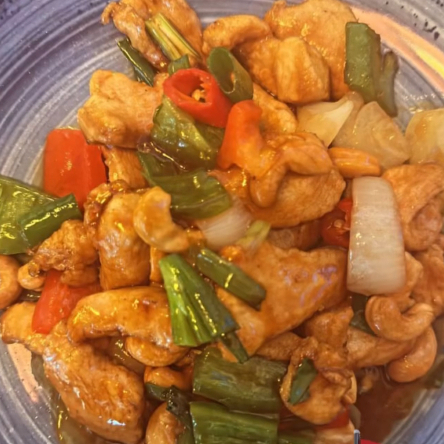 Fatias de frango preparadas com molho de ostra, castanhas de caju, pimentão e cebolinha e pimenta.