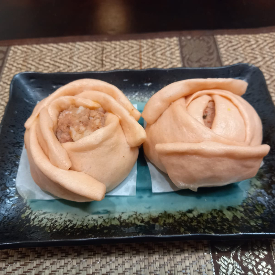 Pao ao vapor rechio com carne de porco moida ,cebolinha,alho,gema de ovo,molho de ostra,pimenta do reino raiz de coentro alho sal e acucar. (2 unidades)