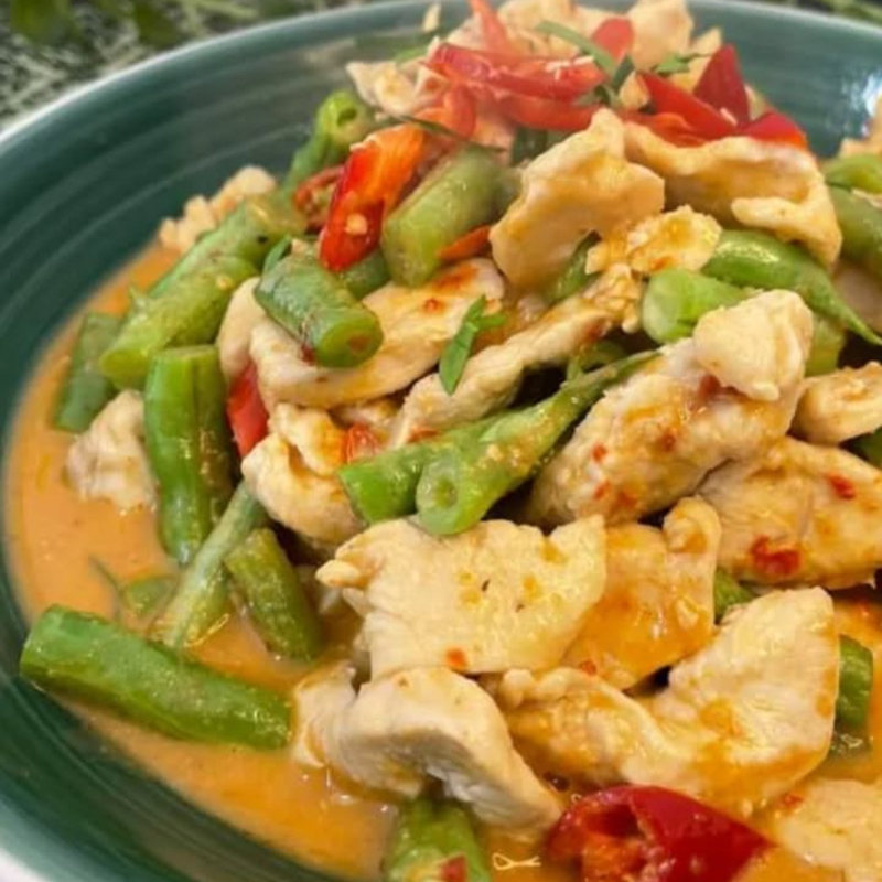 Salmão frito preparado com panang curry, vagem, leite de coco e manjericão. Apimentado.