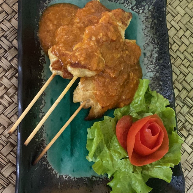 Espetos de frango marinados no leite de coco com especiarias, servidos com molho de amendoim. Levemente picante. (contém 3 unidades)