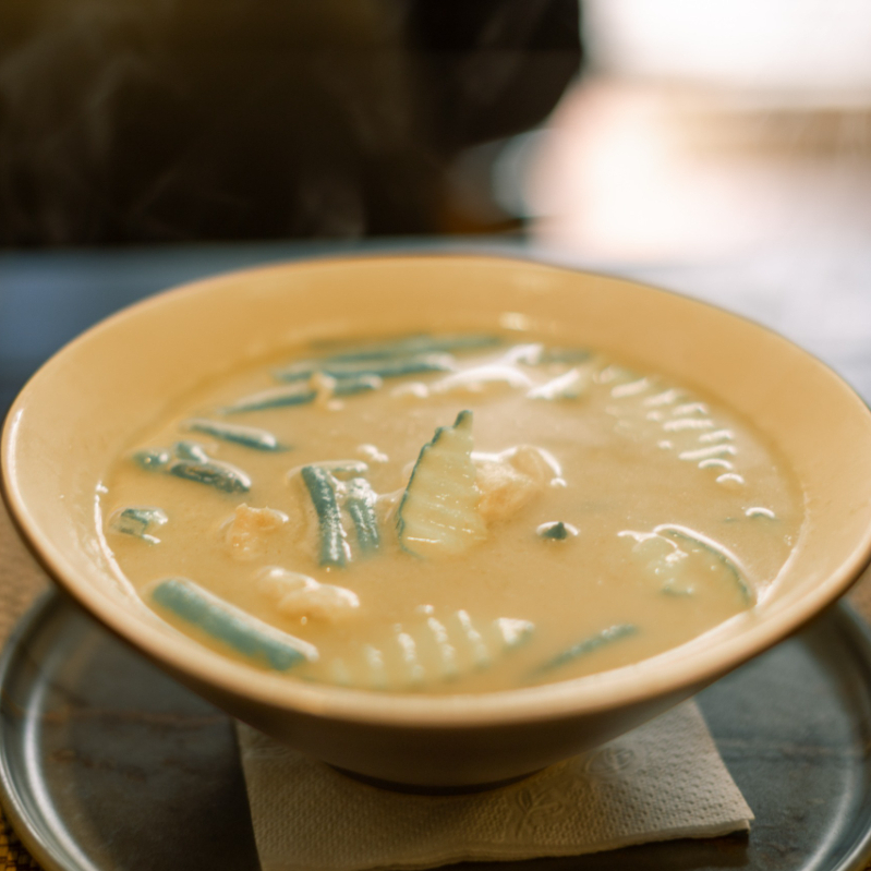 Curry verde preparado com pimenta, legumes, leite de coco, açúcar, folha de limão kaffir e manjericão. Acompanha uma porção de arroz jasmim.