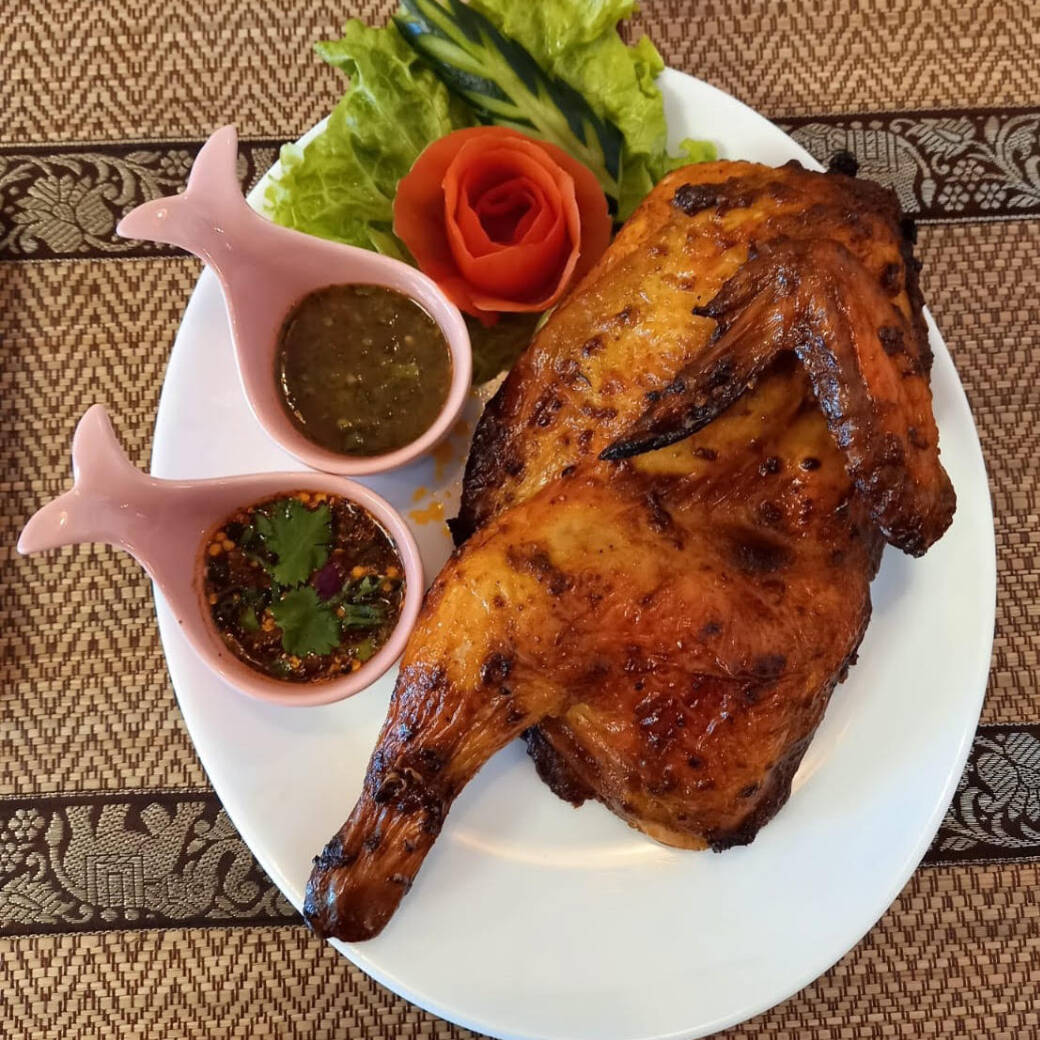 3 espeto de carne suina marinado no leite de coco com especiarias tailandesas, servido com arroz moti cozido