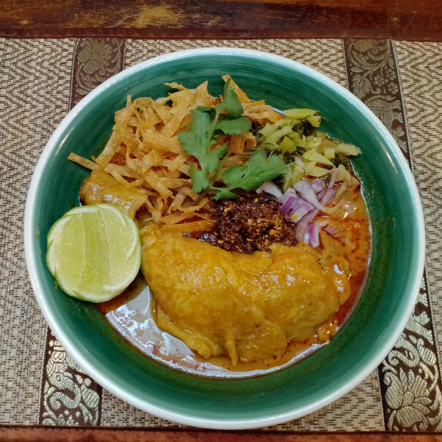 Coxa Sobre Coxa De Frango Ao Curry Vermelho, Leite De Coco, Sal, Açucar Servido Com Macarrao De Ovo Frito. Acompanha Limao