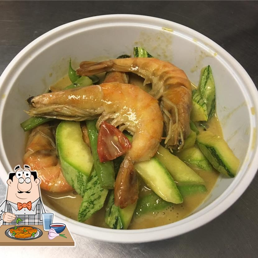 Curry verde preparado com camarão inteiro, pimenta, vagem, abobrinha, leite de coco, açúcar, folha de limão kaffir e manjericão. Acompanha uma porção de arroz jasmim