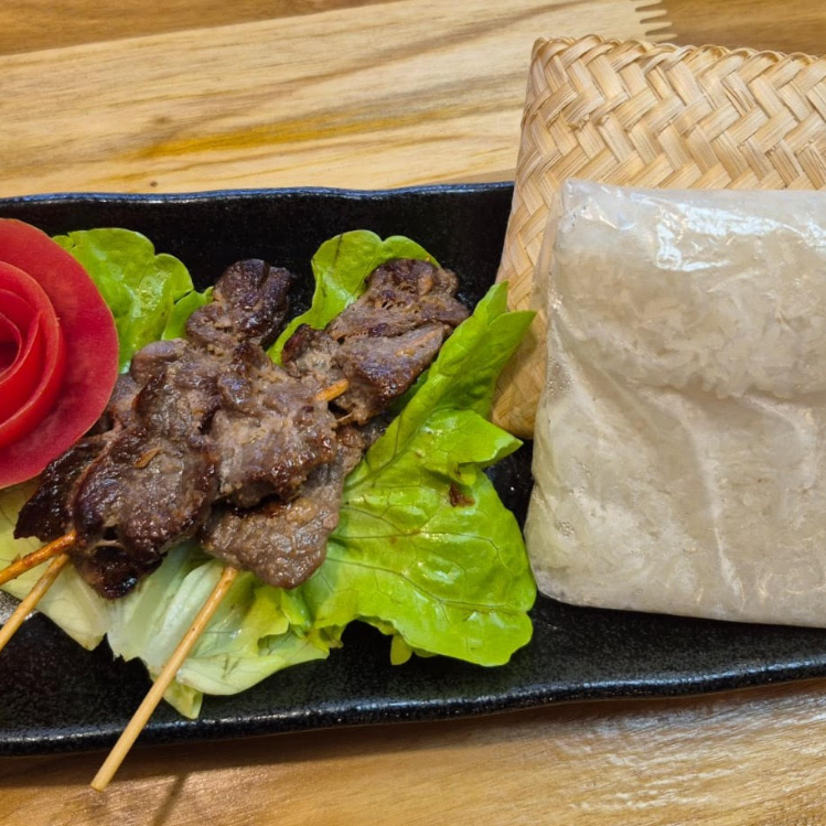 3 espeto de carne bovina com especiarias tailandesas, servido com arroz moti cozido