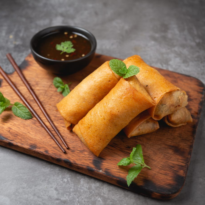 Rolinhos primavera estilo tailandês, preparado com frango, cenoura, repolho e macarrão vermicelli. Acompanha molho agridoce e amendoim. (4 unidades)