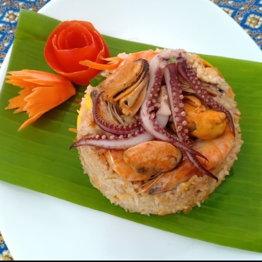 ARROZ FRITO PREPARADO COM CAMARAO, LULA E MEXILHAO, MOLHO DSE OSTRA, OVOS, CENOURA,CEBOLINHA E CEBOLA.