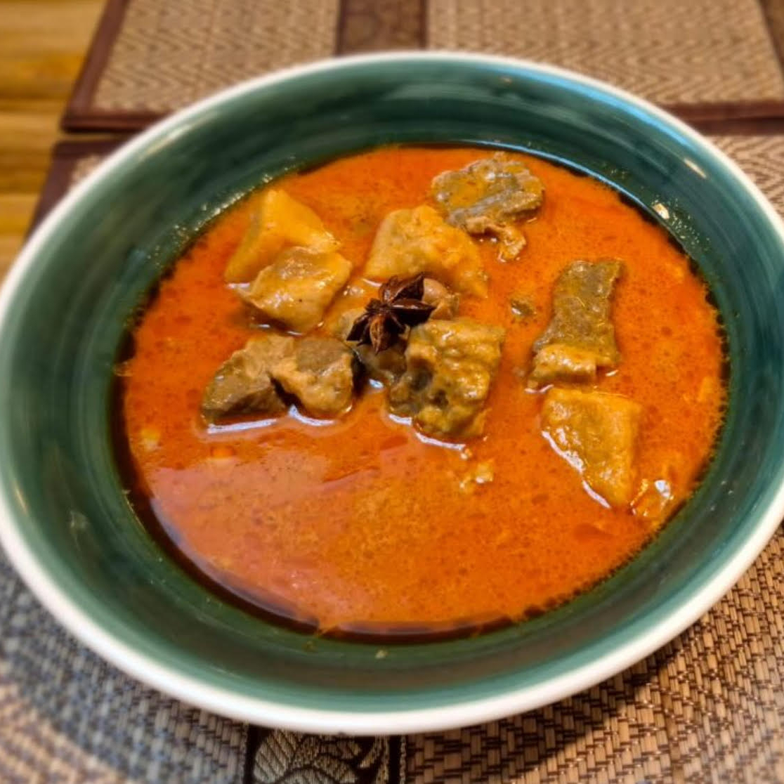 Massa Man Curry, preparado com carne, pimenta, leite de coco, açúcar, batata cozida, amendoim, tamarindo, cebola roxa, suco de tamarindo, Acompanha uma porção de arroz jasmim.
