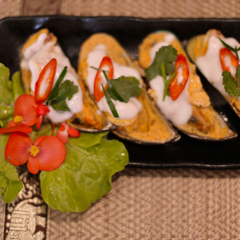 Ao vapor: Mexilhão, camarão, lula, salmão, ovo, leite de coco, curry vermelho, açúcar, sal. Acompanha uma porção de arroz jasmin.