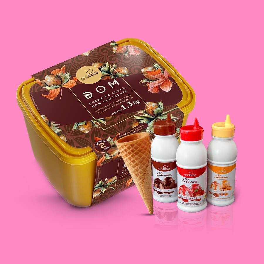 Pote premium de Creme de Avelã com Chocolate, com uma cobertura a sua escolha. Complete com casquinha, cascão ou cestinha! Experimente o sabor irresistível da nossa linha exclusiva Dom.