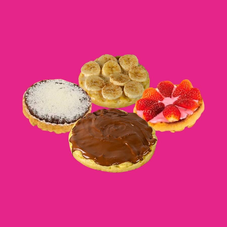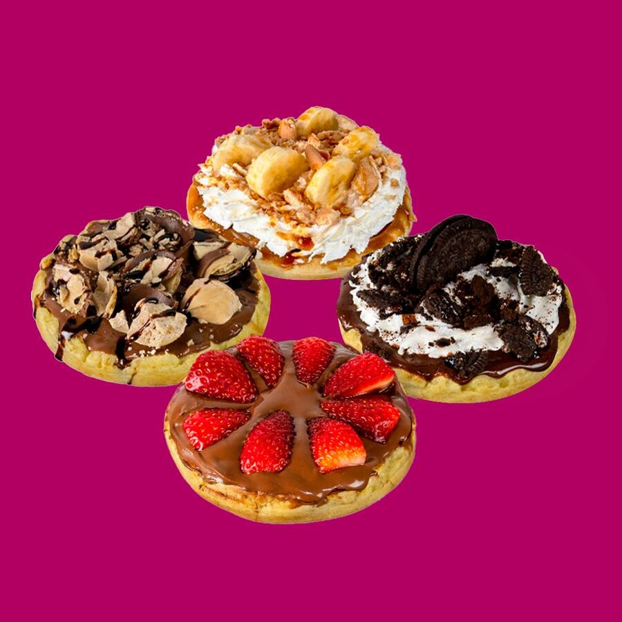Os Waffles mais amados em um combo delicioso: Nutella com Morango, Nutella com Sonho de Valsa, Banoffee e Oreo. Quatro versões para saborear no conforto de casa!