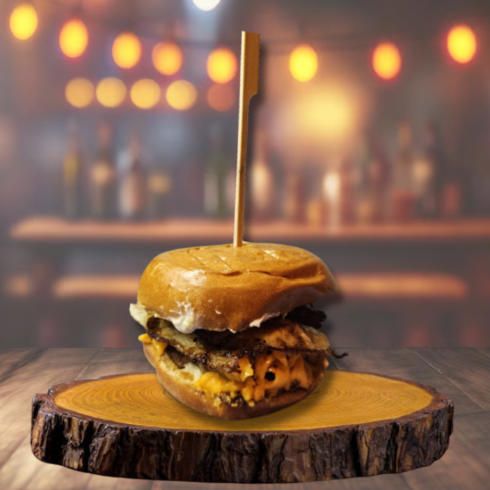 Um hambúrguer forte no sabor e na sustância! Servido no pão de brioche macio e levemente tostado, com hambúrguer artesanal de 120g de carne bovina, suculento e preparado no ponto certo. Coberto com duas fatias generosas de cheddar cremoso, bacon crocante, ovo perfeitamente preparado e finalizado com molho barbecue defumado, que dá aquele toque marcante ao lanche. 🔥 Um hambúrguer potente, suculento e cheio de personalidade — feito para quem tem fome de campeão! 💪🍔
