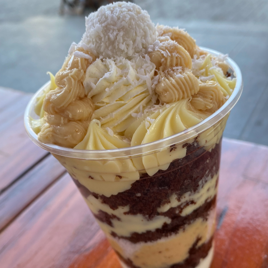 camadas intercaladas de um suave bolo de chocolate e um creme mousse aveludado. Entre estas camadas, encontra-se um irresistível creme de chocolate, recheado com pedaços crocantes de biscoito Oreo, que proporciona uma textura inigualável. Para completar, uma camada de creme pâtisserie e mais biscoito Oreo no topo, garantindo uma experiência de sabor única