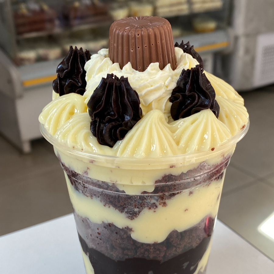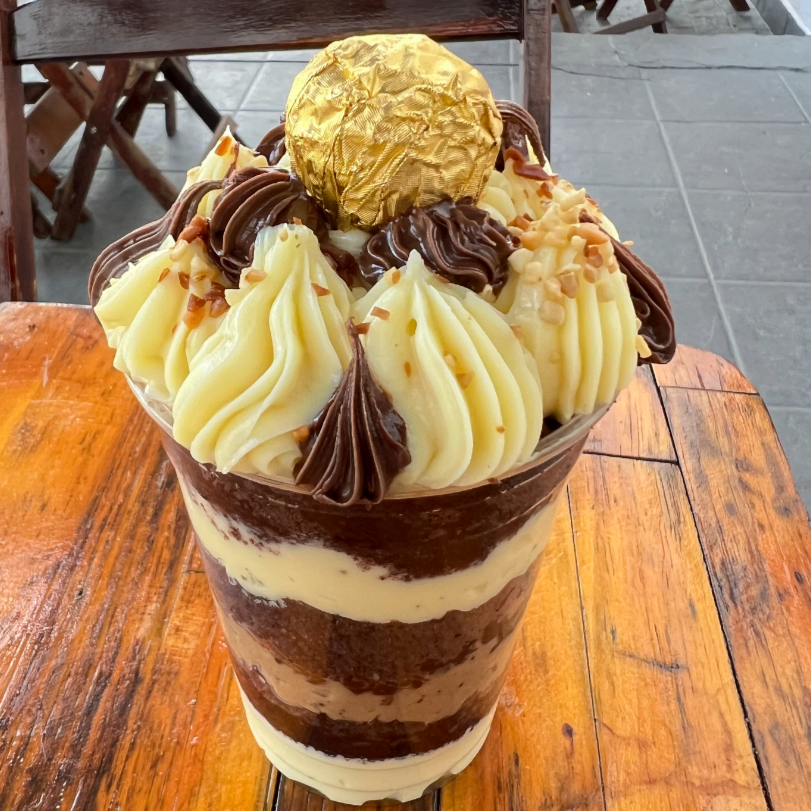 Camadas de bolo de chocolate Camadas de creme mousse Nutella e castanhas Creme pâtisserie Serve bem uma pessoa Copo de 400 ml