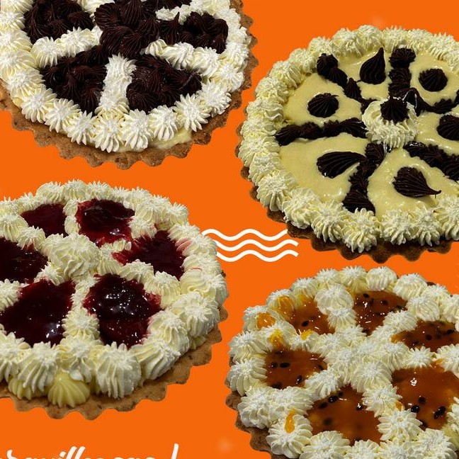 Massa crocante Base de leite condensado cremoso Creme mousse Calda de maracujá Aproximadamente 500 gramas