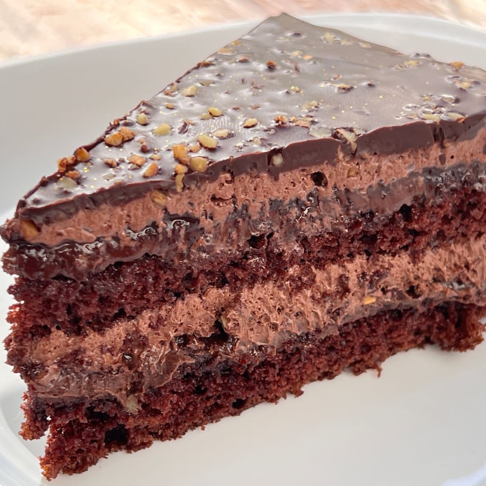 Deliciosa massa de chocolate belga Recheio e cobertura de mousse de chocolate. Aproximadamente 100 gramas