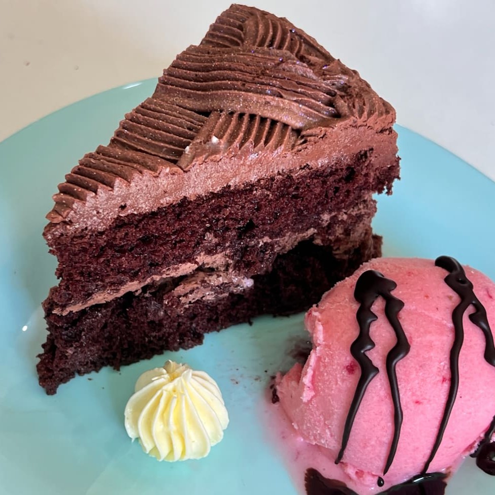 Deliciosa massa de chocolate belga Recheio e cobertura de mousse de chocolate. Aproximadamente 100 gramas de bolo Aproximadamente 100 gramas de sorvete