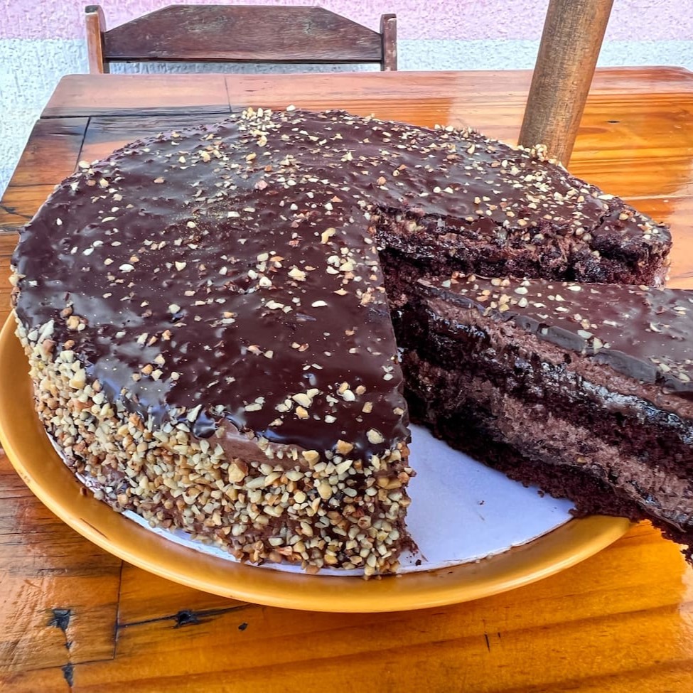 Deliciosa massa de chocolate Recheio de Nutella, castanhas e mousse de chocolate Cobertura de chocolate e castanhas Aproximadamente 100 gramas