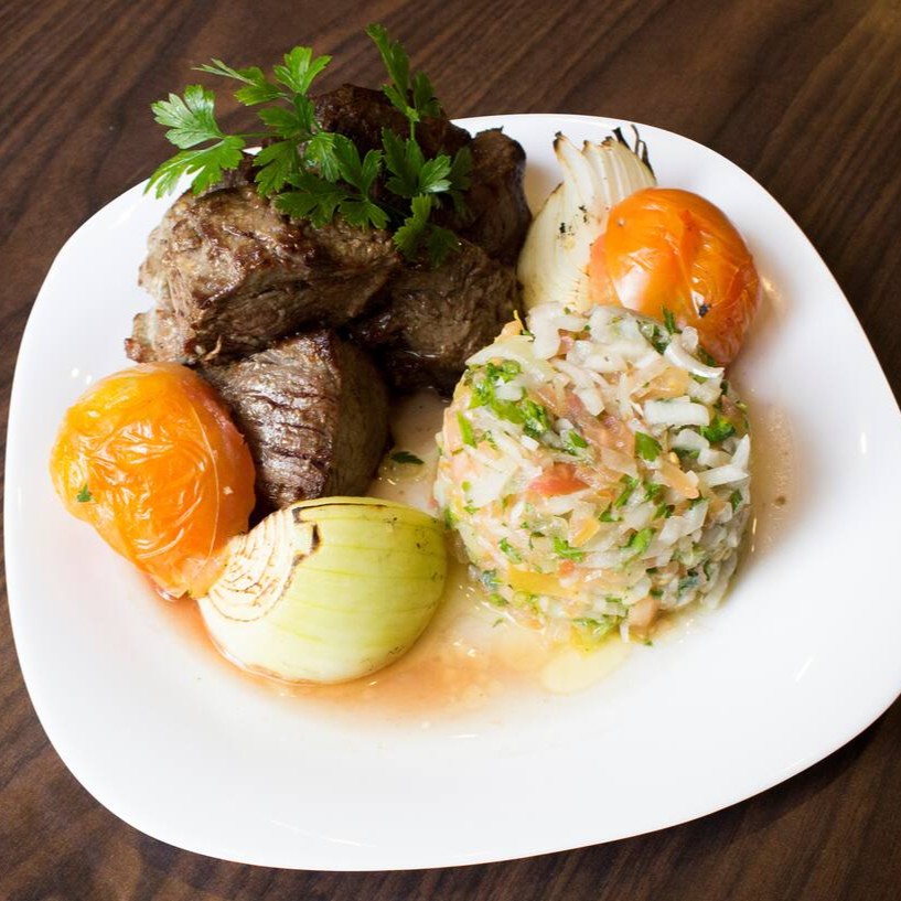 Cubos de filet mignon assados na brasa, acompanhado de vinagrete, arroz com lentilha.