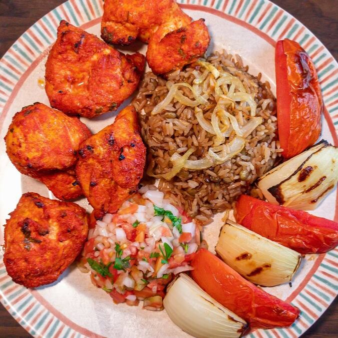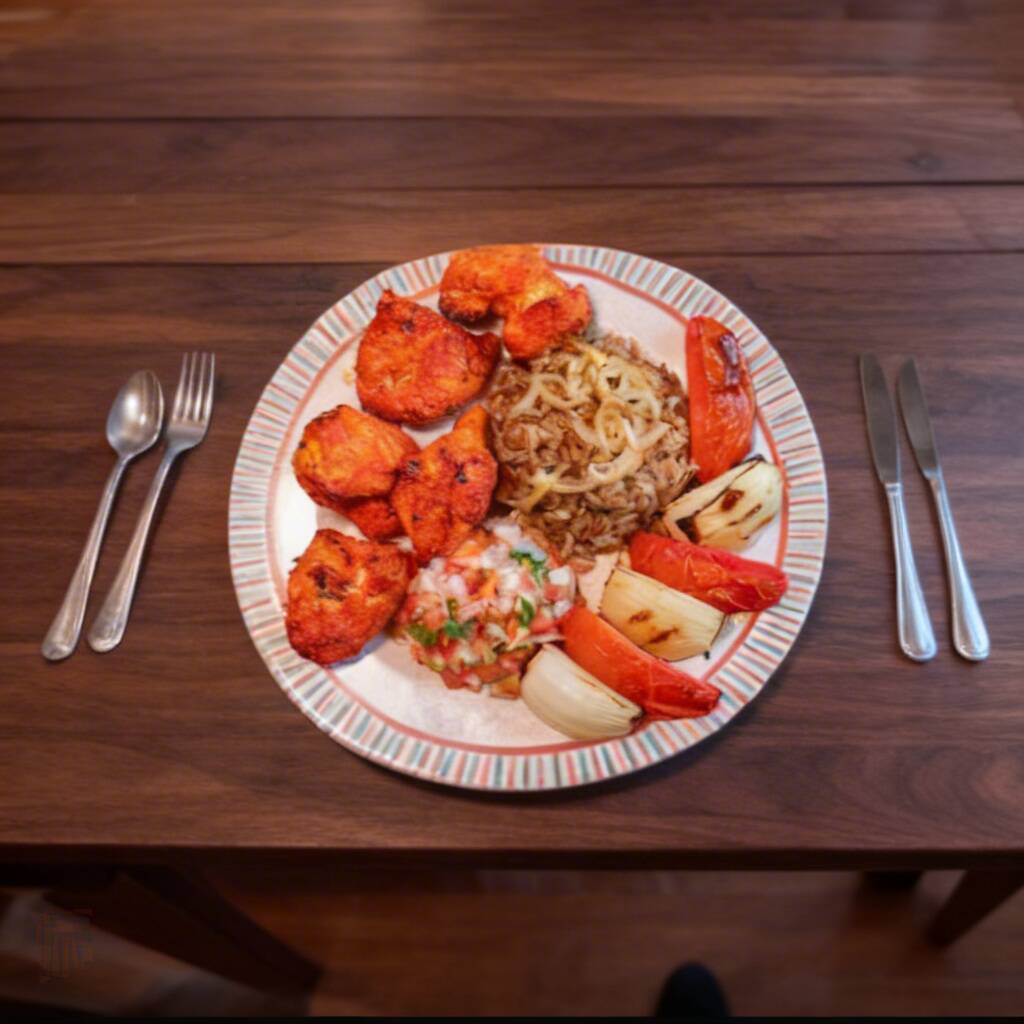 Cubos de filé de frango assados na brasa, acompanhado de vinagrete, arroz com lentilha.
