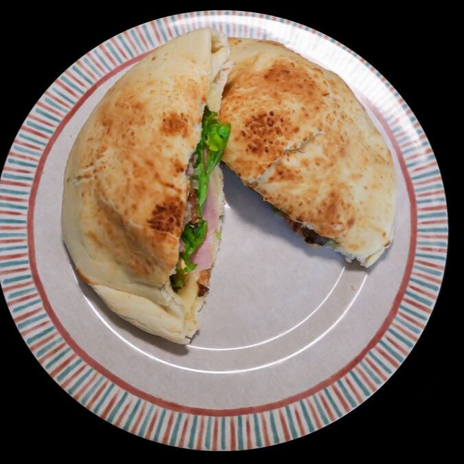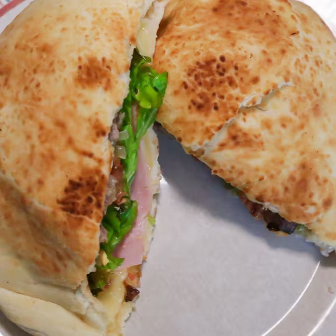 Recheado com alface, tomate e cebola + Presunto, queijo e ovo.