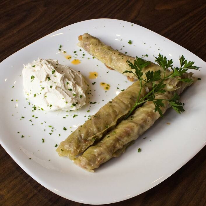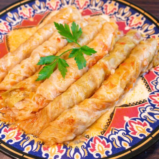 Folhas de repolho cozidas, recheadas com arroz e carne.