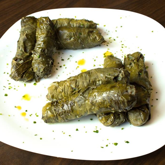Folhas de uva recheadas com arroz e carne, temperadas à moda árabe.