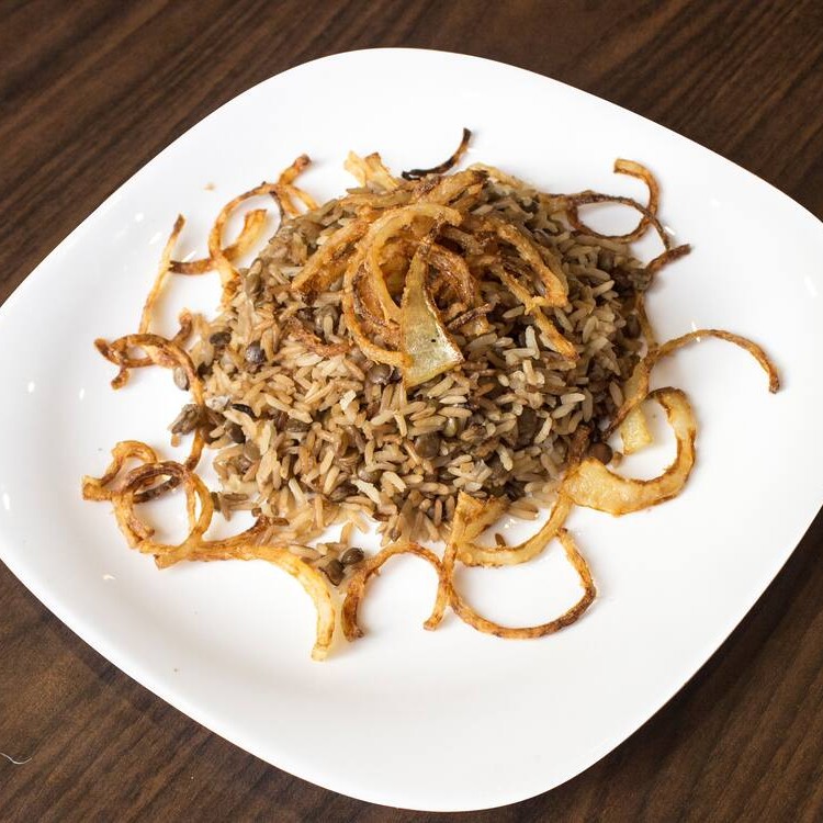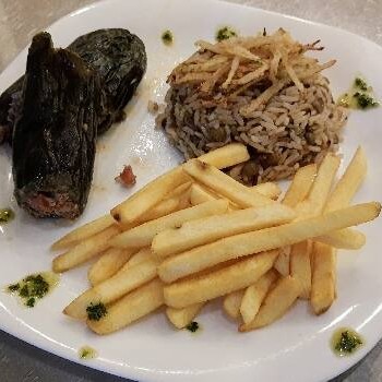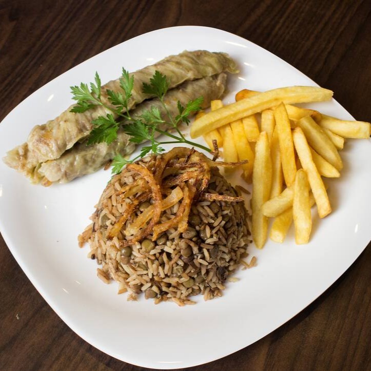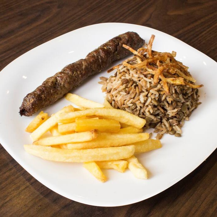 Kafta + vinagrete+ fritas+ arroz com lentilha.