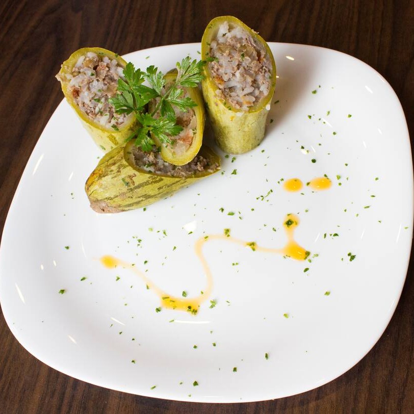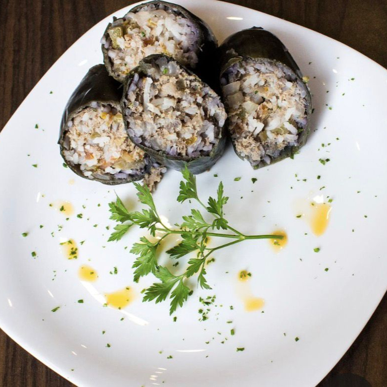 Recheadas com arroz e carne, temperadas à moda sírio-libanesa, ao molho de tomate.