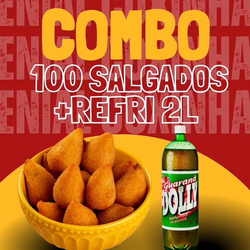 A combinação perfeita para sua festa ou reunião! São 100 mini salgados sequinhos e recheados, feitos na hora, com sabores irresistíveis: Coxinha de Frango, Bolinha de Queijo, Risole de Presunto e Queijo e Bolinho de Calabresa. E para completar, ganhe um refri guarana de 2 litros grátis