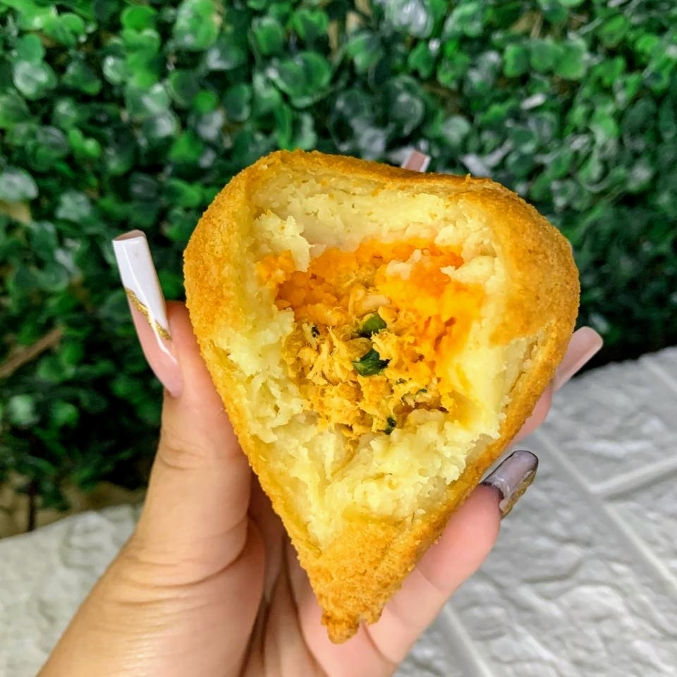 Coxinha De Carne seca c/ Queijo você encontra aqui encante-se com nossa exuberante Coxinha de Carne Seca e Queijo, Uma deliciosa experiência gastronômica em cada mordida, com uma massa de batata incrivelmente macia que desmancha na boca, generosamente recheada com uma suculenta carne seca desfiada e temperada à perfeição. A cremosidade do queijo agrega um sabor extra, tornando este prato irresistível. Aproxi. 150g de grande com massa batata , Coxinha grande com massa batata ,Rolinho salsicha ,frango Catupiry,cheddar,Torta calabresa triturada com queijo ,coxinha carne seca com queijo ,bo