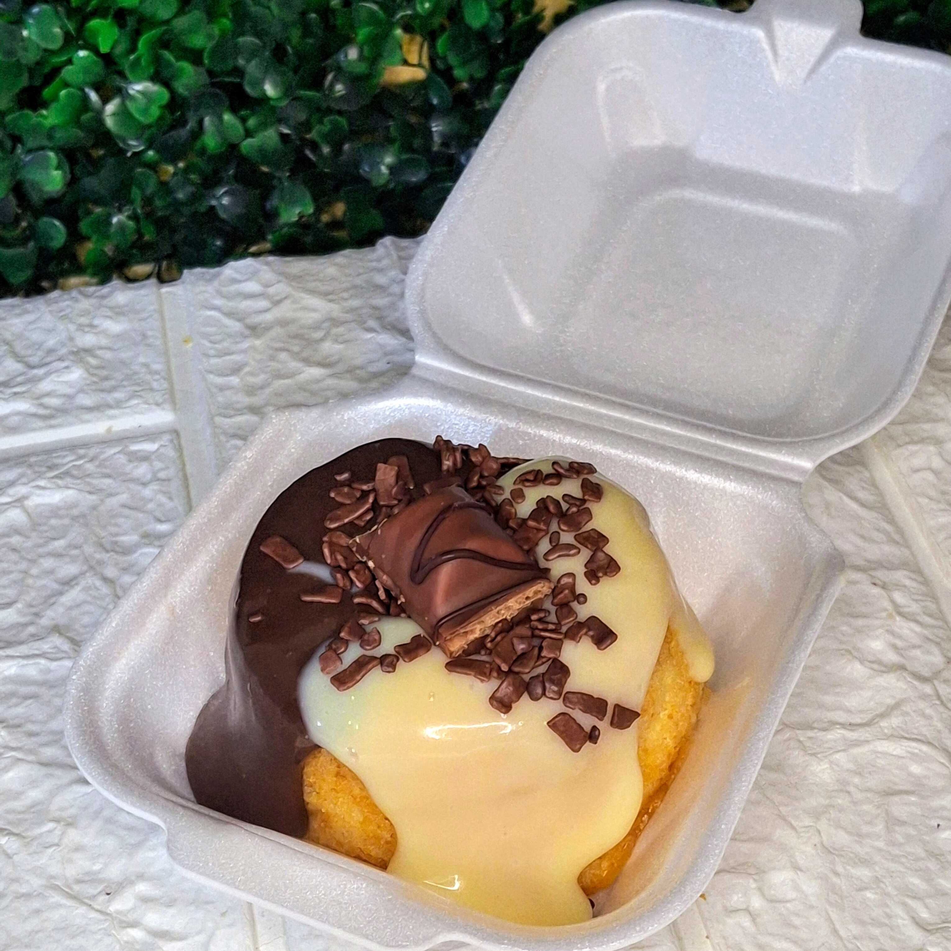Mini caseirinho vulcão kinder Bueno, feito na massa fofinha de leite com duo caldas ,granulado flocado e chocolate kinder Bueno de decoração. Serve uma pessoa pesa aproxi.200g