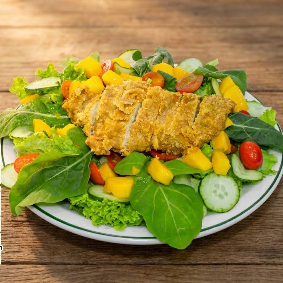 100g de frango empanado na aveia, alface americana, rúcula, pepino, tomate cereja e cubos de manga, regados ao molho a base de queijo especial da casa.