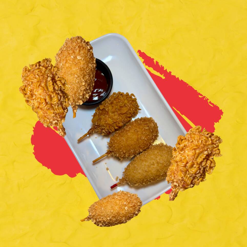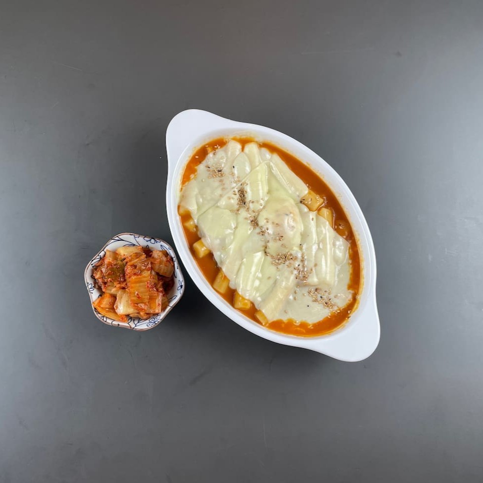 Massa de arroz (tteok) com molho apimentado, levemente adocicado, acompanha uma massa de peixe, verduras e queijo mussarela derretido.