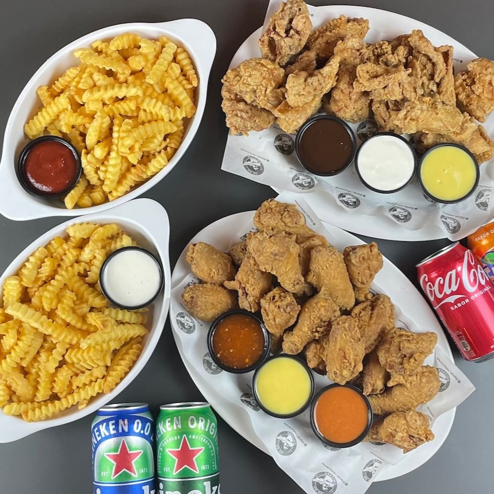 - 2 porção de chicken (1100g x 2) - 2 porção de batata frita ( 600g x 2) - 8 molhos - 1 de 2 litros de refrigerante - Os valores são referentes aos pesos dos produtos in natura e podem sofrer alteração por conta do processamento/cozimento. Serve até 4 pessoas (aprox. 2400g)
