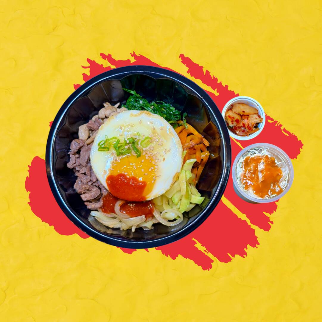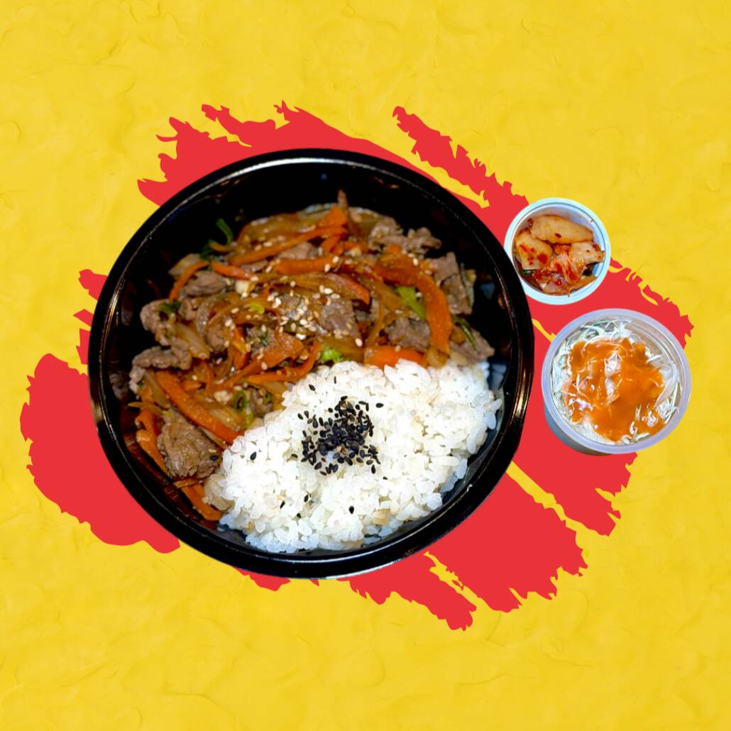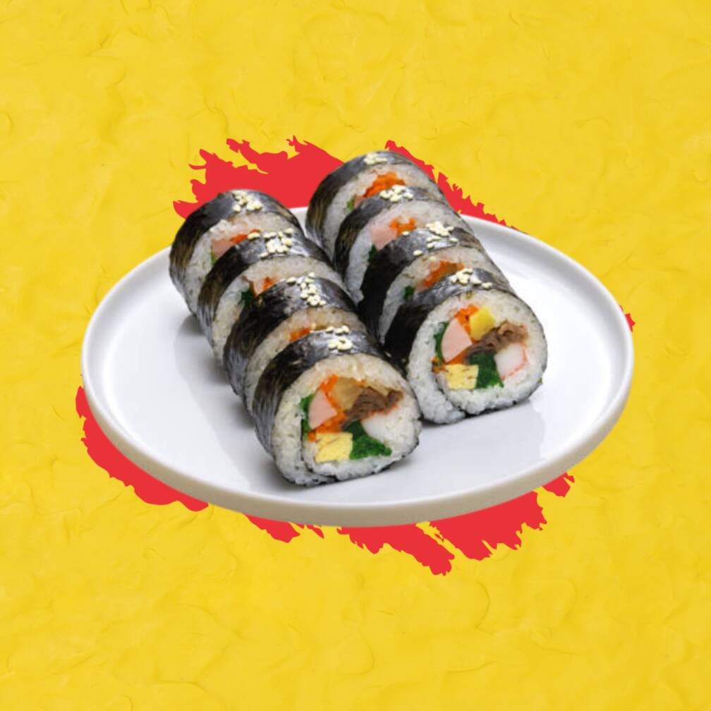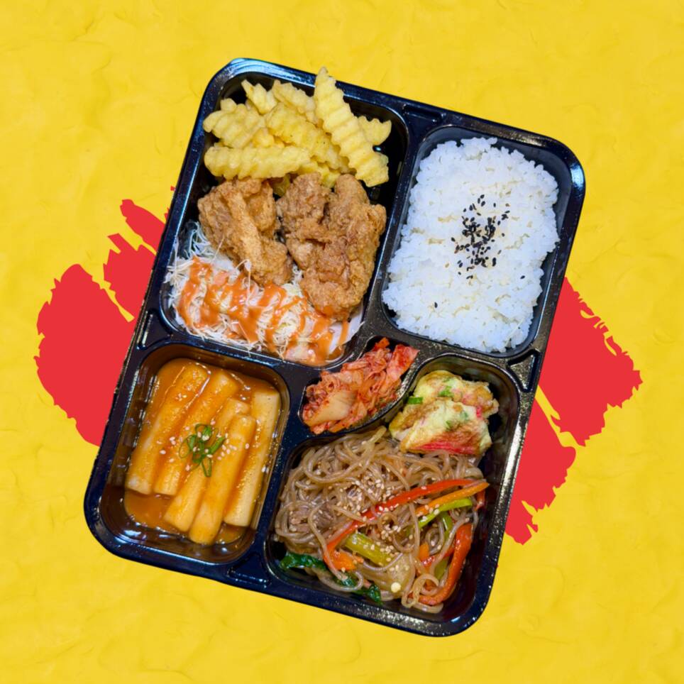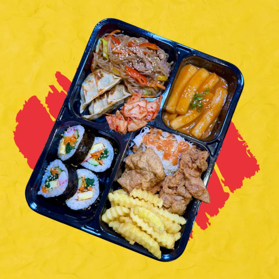 Kimbap, macarrão de batata doce, topokki e mandu.