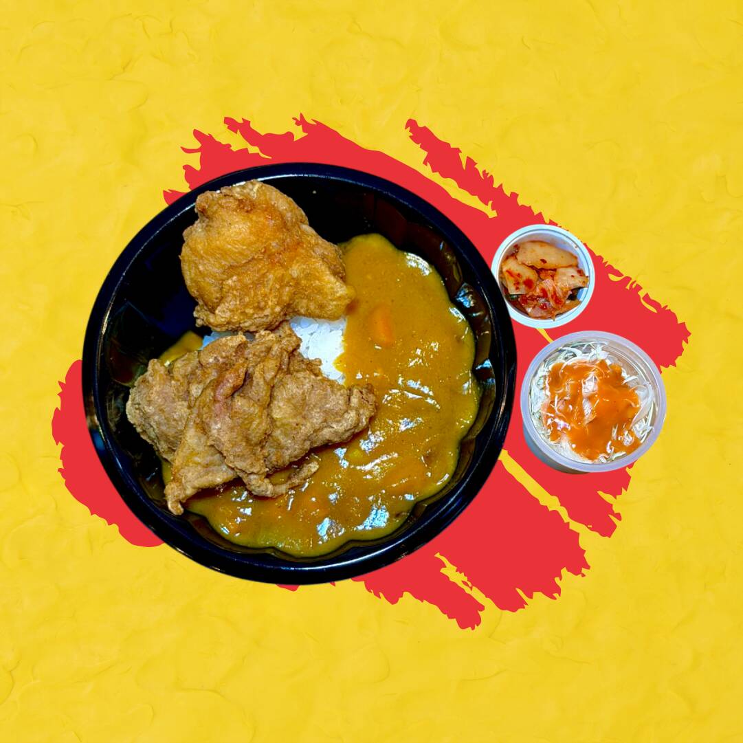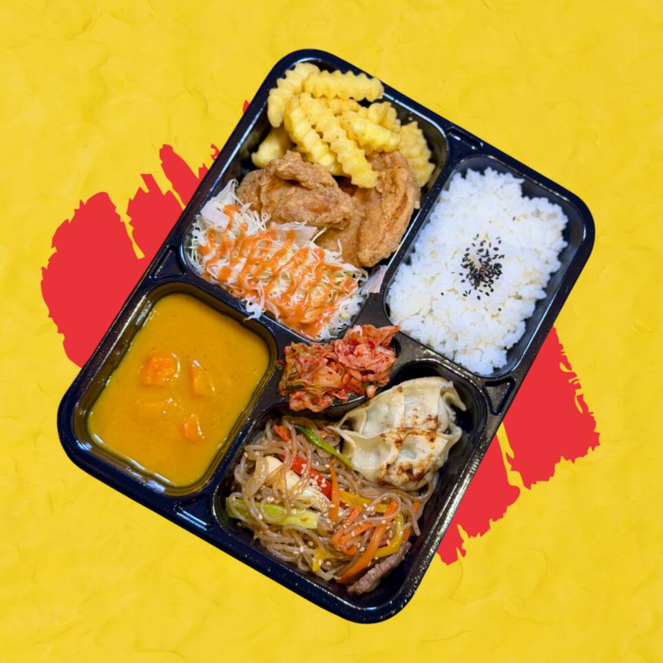 Kare, arroz, macarrão de batata doce, frango e mandu.