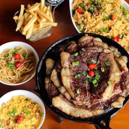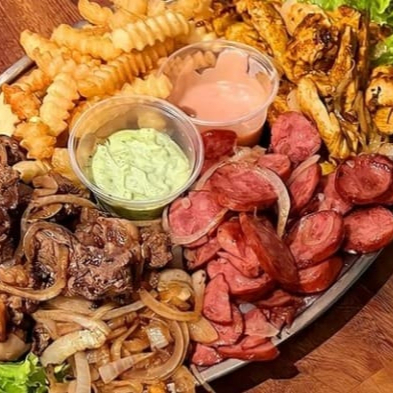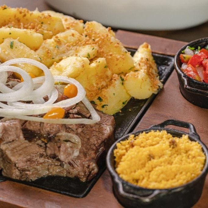 Filé mignon, baião, batata canoa e queijo coalho.