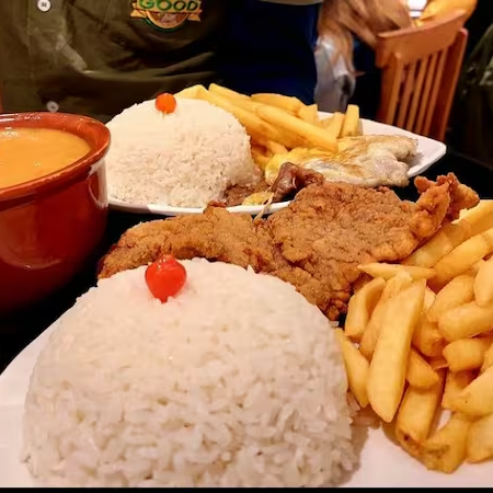 Filé mignon, arroz e batata frita.