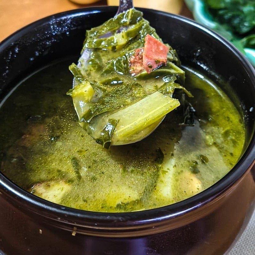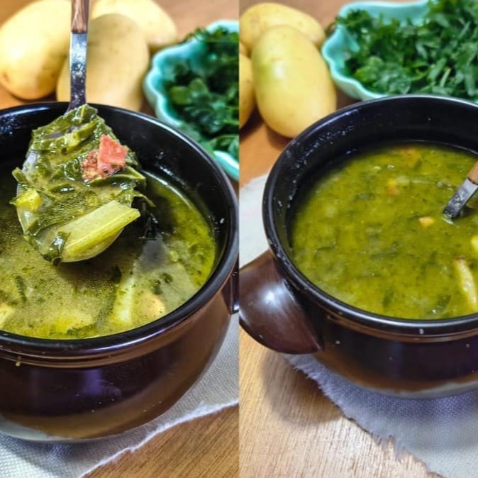 Um excelente caldo de couve manteiga batido com batata e calabresa.